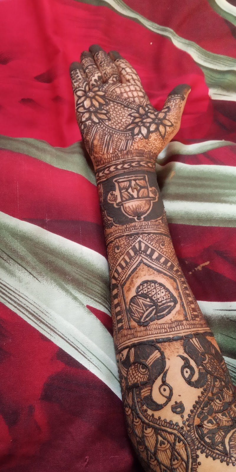The bridal mehendi service by Mehndi mystery covers both hands up to the elbows and feet up to the knees, with the option for additional designs on the arms, back, and neck as per the bride's preference.