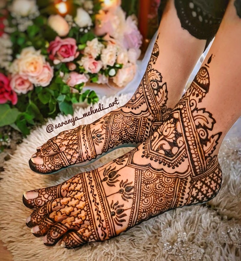 The portfolio of Saranya Mehndi Art (Coimbatore's Best Henna Artist) showcases hundreds of bridal and guest mehendi designs — browse their work to get inspiration and communicate your desired style before your appointment.