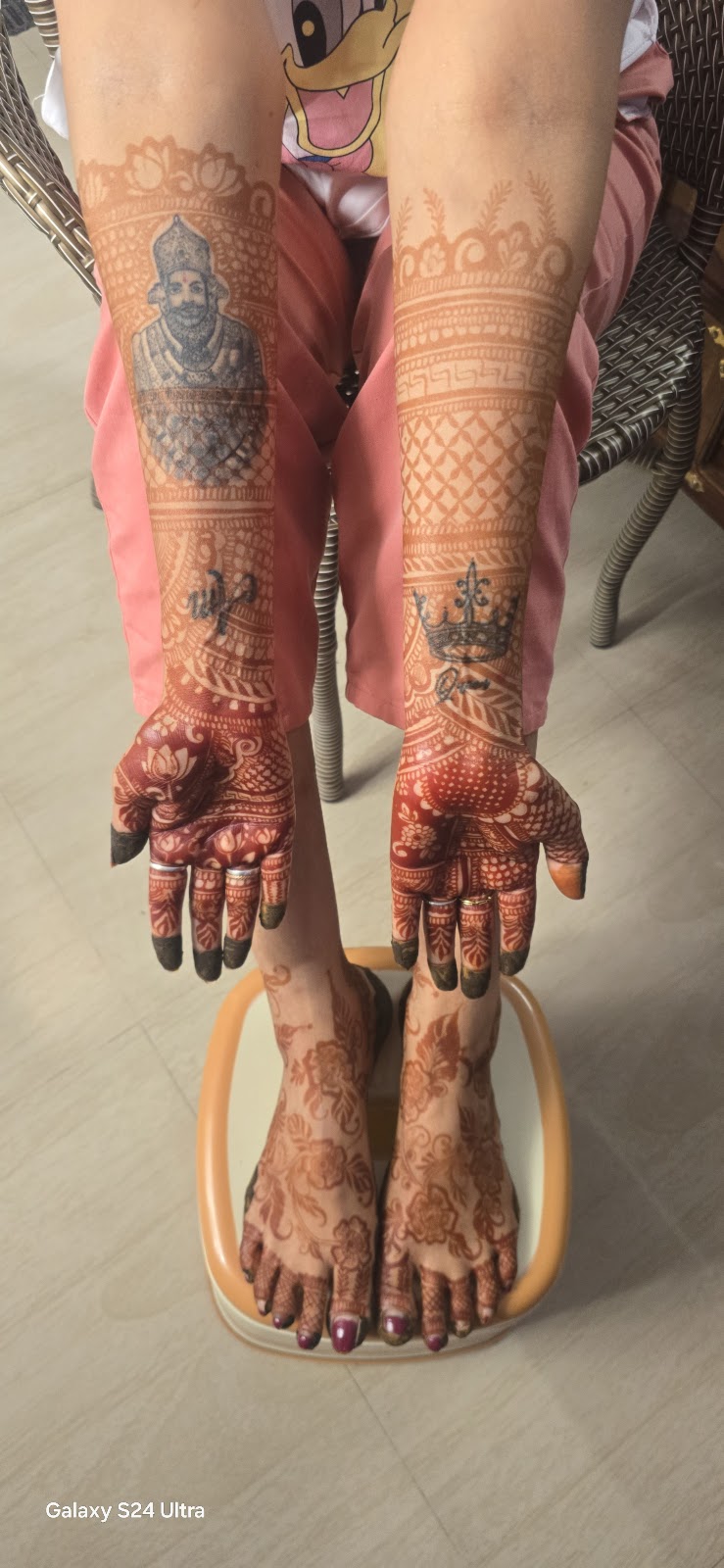 The bridal mehendi service by Anil Mehandi Artist-Best Bridal Mehandi Artist in Jaipur/Mehandi Artist in Jaipur/Home Services Free covers both hands up to the elbows and feet up to the knees, with the option for additional designs on the arms, back, and neck as per the bride's preference.