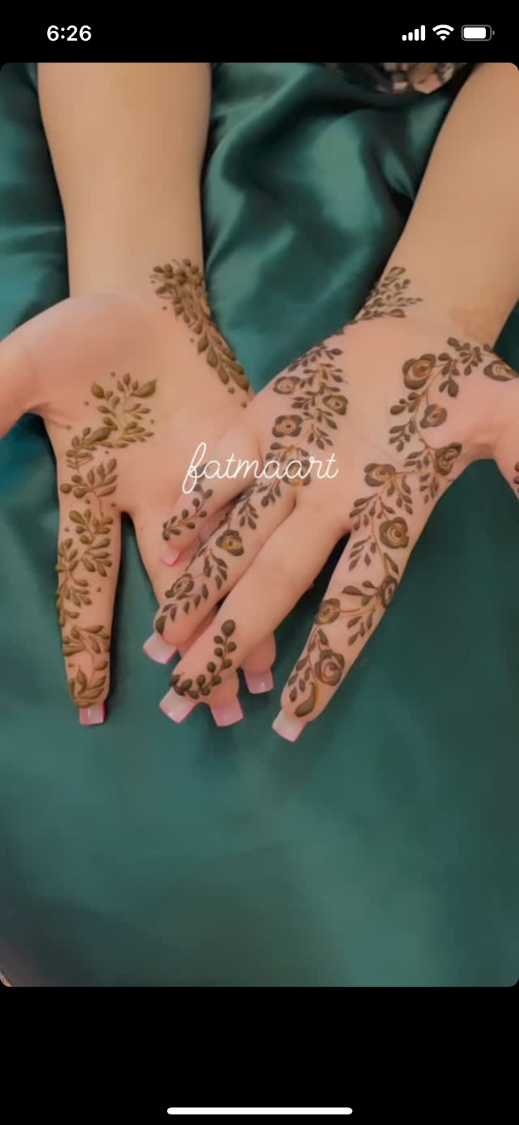 Thank you Fatma you made my bridal heena stunning your are so kind girl ever I meet all mehendi artist I can't describe how your work are amazing once again thank you so much