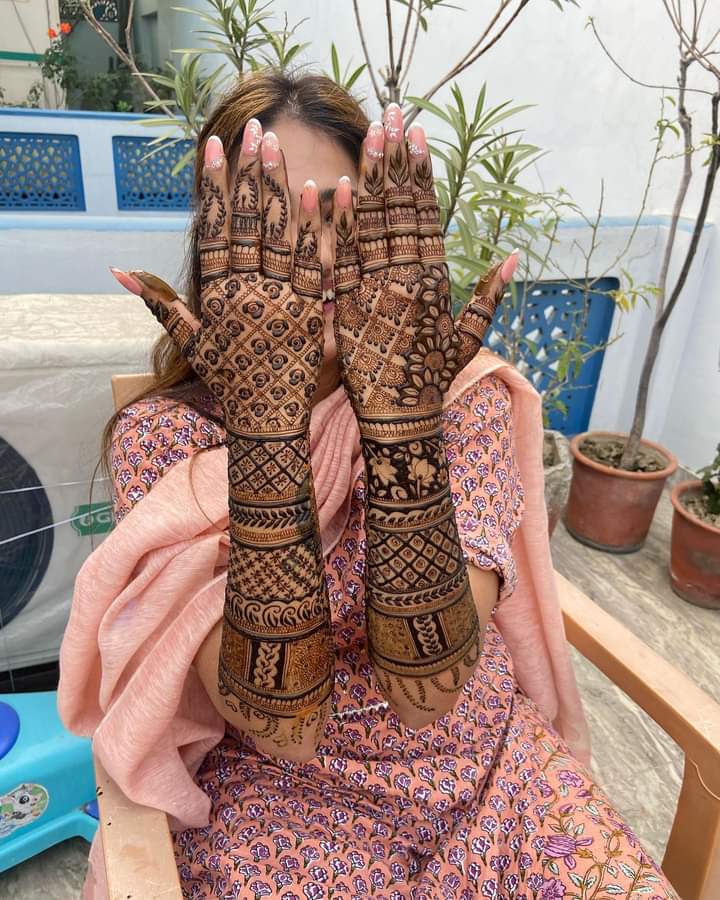 The bridal mehendi service by Neeraj Gupta Mehandi arts best mehndi designer Kolkata covers both hands up to the elbows and feet up to the knees, with the option for additional designs on the arms, back, and neck as per the bride's preference.
