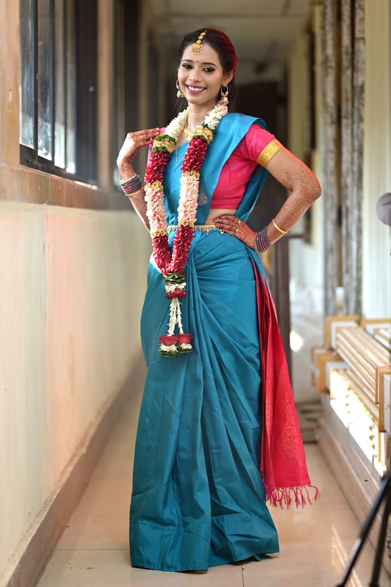 I availed Hema's services for my south indian Tambrahm wedding and I was super impressed with her professionalism and spot on make-up for every look she provided for me and my mother. Hema is a complete package! She is persistent, diligent and patient with every look and she doesn't stop until she achieves perfection. She uses very high quality products which makes the skin glow and does not cause any side effects on sensitive skin. She also has a wide range of options for artificial jewellery and she guides you through the process for every saree. (Note: I didn't use artificial jewellery for my earrings and necklaces, I only used kamarbandh and maatha bindi from her collection). Her saree draping skills are marvelous, the pleats are perfectly aligned and for a person who cannot carry a saree (like me :P) can comfortably move along like a normal dress. Overall my experience with her was amazing and I would definitely recommend her hands down for any ocassion.