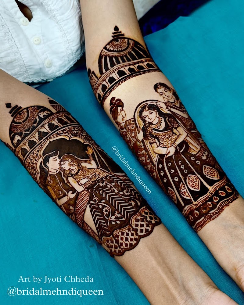 Hi Everyone, Here, I would like to share my honest feedback about getting my bridal mahendi by jyoti chheda and team.First of all when I got to know about her, I researched and realized the designing and sharpness in her work is just amazing.I placed my requirements to her and she was so happy to help me.With all professionalism and creativity she made Sketch of the mahendi before drawing it on my hand.I wanted all beautiful elements in my hand..modern and traditional..we finalized elements like Europe timelines which included 6-7 countries, alladin , Jasmin, mickey and Minnie, ganesha, dumbs,traditional bride and groom, our names, horse, elephants, etc.So the design was finalized She had shared the setup they needed for drawing mahendi.This was also very professional. The team arrived on time, very well organized team..they started mahendi for me as well as my family. I was dancing, enjoying my moment and just before I could start getting exhausted they were done.Just in 4 hours my dream bridal mahendi was done.I didn't even realize..they did let me enjoy Every moment of that 4 hours..I was eating, dancing, singing, making pictures. I loved the experience and I would definitely recommend to all the brides out there who is looking for a perfect mahendi artist. I hope this helps to make the big decision.
