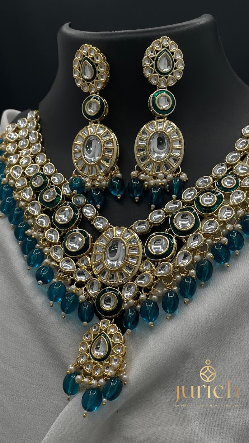 Jurich - Jewellery, Accessories & Cosmetics offers a comprehensive range of bridal jewellery — necklace sets, maang tikkas, earrings, bangles, kadas, nose rings, haath phool, kamarbandh, and anklets in gold, silver, and kundan settings.
