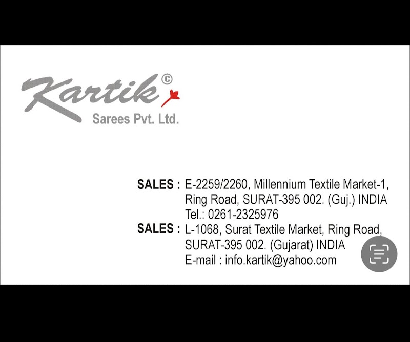 Highly Recommended for Wholesale Saree Shopping! 5/5 Stars Kartik Sarees Pvt Ltd in Surat truly stands out as a top destination for anyone looking for the latest and highest-quality sarees, especially if you're buying in bulk or for business. The collection is absolutely massive, spanning everything from everyday casual wear and printed sarees to heavy bridal and designer pieces. I was particularly impressed by the sheer variety of fabrics and the up-to-date designsβthey clearly keep pace with the current market trends. This is the place to come for a diverse and modern inventory. The staff was professional and highly knowledgeable about the materials and the manufacturing process. They helped us navigate the huge stock quickly and efficiently, making the wholesale experience seamless. The pricing is very competitive, as you would expect from a trusted Surat wholesaler. If you are a retailer or running a boutique, I highly recommend making this your primary sourcing stop. Excellent quality, great variety, and dedicated service.